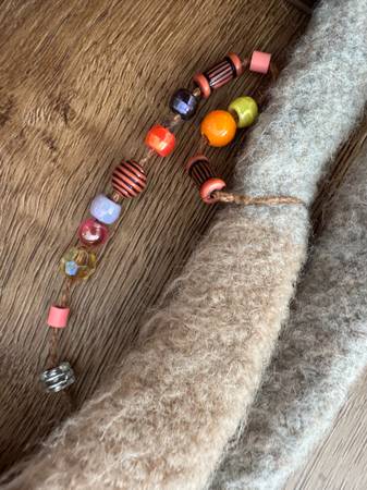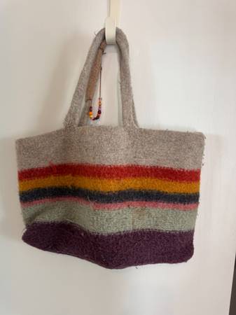 Handmade Colorful striped Felted wool tote bag with beaded handle Great condition- no tears, holes, rips ets Approximate measurements: 21” W x 13”H (or 23f” includes handle) $27 See include "more...