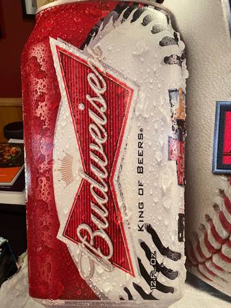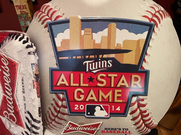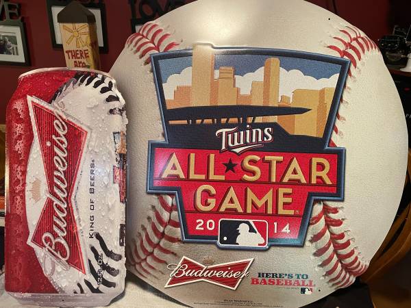 Rare in New Condition Metal Budweiser 2014 Twins All Star Game Day Sign. The Official Beer of the Major League Baseball printed on a Painted Baseball with Twin Cites Skyline on it. Also a Can of Bud along side of it.