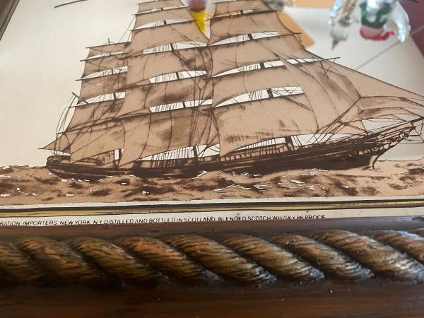 Rare 80's Cutty Sark Scotch Nautical Mirror Bar Sign. With a 1869 British Clipper Whisky Ship, With A Rope on Around Frame. This is a Nice Rare Promotional Liquor Store, Tavern or Man Cave Display Mirror.