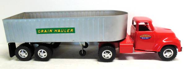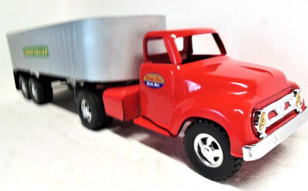 CUSTOM RESTORED 1956 TONKA SEMI TRACTOR AND RESTORED TONKA GRAIN HAULER TANDEM TRAILER ALL NEW TIRES, CHROME AND SMALL PARTS WHEN BUILT 26 in. LONG X 6 in. TALL X 6 in. WIDE - ALL STEEL $725.00 -...