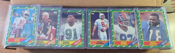 Up for sale is a high-grade, hand-collated 1986 Topps football set featuring include Jerry Rice, Boomer Esiason, Reggie White, Steve Young, Andre Reed, Bruce Smith & Bernie Kosar rookie cards!!