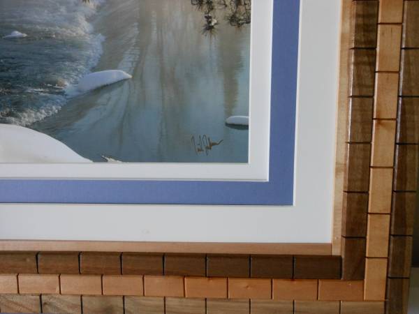 Artwork is titled "WINTER DAM" and it is signed. Frame size is 29" X 23". The wood tiles are 1/4" X 3/4" X 1 1/2" and are made from 1 row of Walnut 1 row of Maple Ambrosia and 1 row of Walnut and the trim is Maple Ambrosia. All woods used are either reclaimed or from sustainable growth forests.