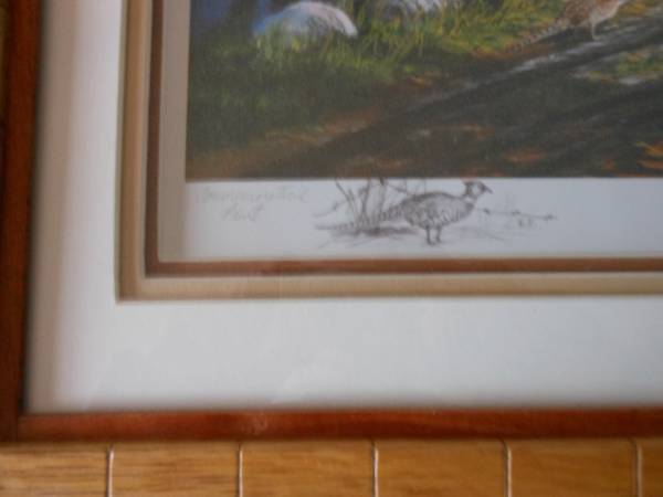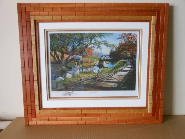 Ken Zylla artwork titled "NARY A CARE" and it is signed. Frame size is 27" X 23". There are 3 mats on the artwork- Pecan, Wicker, and Artic White. The wood tiles are 1/4" X 3/4" X 1 1/2" and are made from 3 rows of Tiete Rosewood grown in South America and 1 row of White Oak grown in Minnesota. The trim is Santos Mahogany grown in West Africa. All woods used are either reclaimed or from sustainable growth forests.
