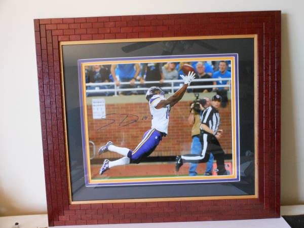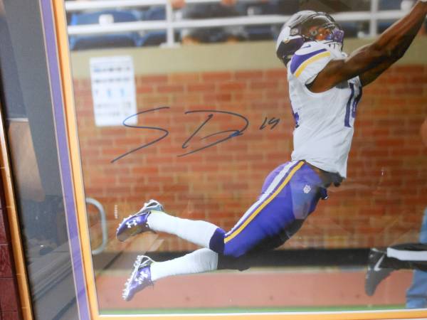 Photograph is of Minnesota Vikings # 14 Stephen Diggs it is signed and comes with a C.O.A. Frame size is 32" X 28". There are 3 mats on the photograph- Yellow, Imperial Plum, and T V Black. The wood tiles are