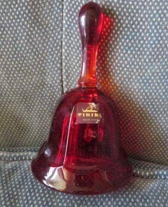 Ruby red Viking glass bell, hand made. About 6" tall, 3 5/5" across the base. Nine-panels around, each one ending with a curve down into the lower border. Crystal clanger hanging by silver chain. Perfect condition. Sat in my mother's china cabinet for years. $10
