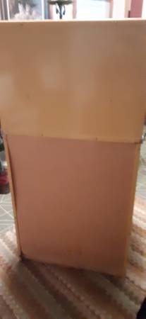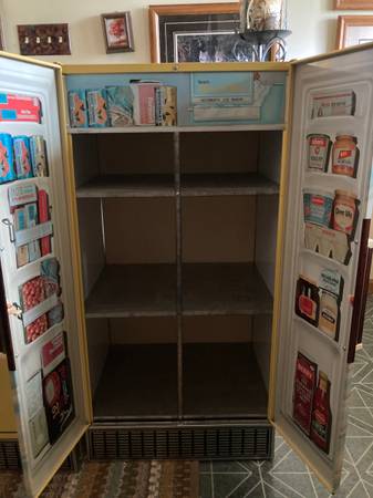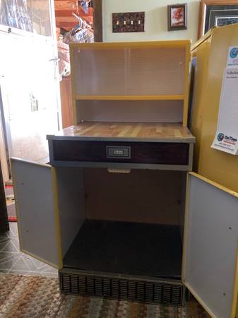 (2) Cupboard, with plastic-door-shelf above (I’ve seen other models with no upper shelf). Back is cardboard on the bottom, tin on top.