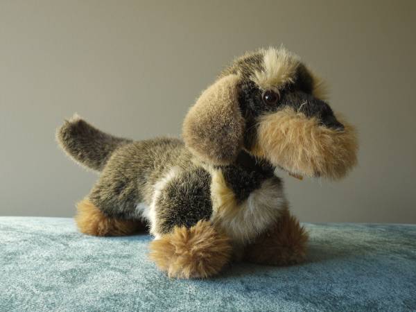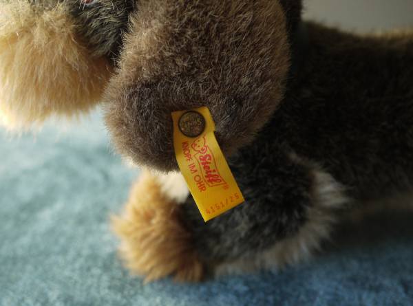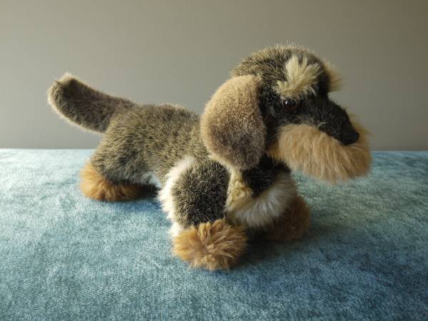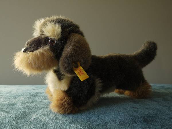 Steiff 4151/25 Raudi Long-haired Dachshund Plush Dog vintage stuffed animal purchased in (then) West Germany in 1989. This medium-sized plush dog is recommended for children aged 3 and above. With its long hair and adorable design, this Steiff plush dog is a charming and timeless toy that is perfect for young animal lovers who appreciate high-quality and collectible toys. Complete with tag and dark green leather collar. Super clean, from a non-smoking home, only handled by adults.