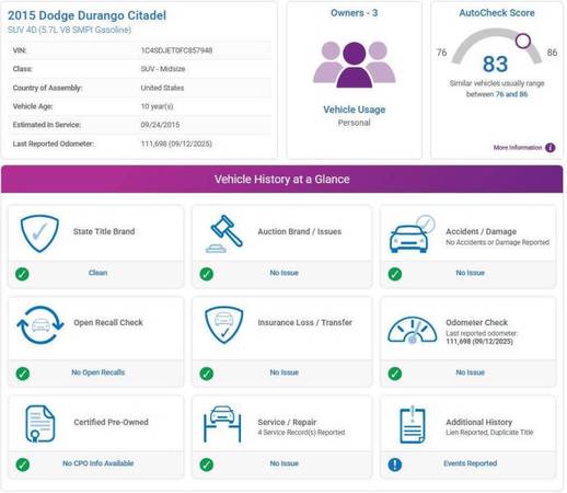 This vehicle is located in our Burnsville store. CLEAN TITLE!! NO ACCIDENTS!! FRESH OIL CHANGE!! POWERFUL 5.7 HEMI!! The 2015 Dodge Durango Citadel with the 5.7L HEMI V8 is a powerful three-row SUV that combines muscle with comfort. It puts out 360 horsepower and can tow up to 7,400 lbs, making it a solid choice for hauling or long road trips. This Citadel trim is the top-tier model, so it comes fully loaded—leather seats, heated and cooled front seats, heated second row, a power sunroof, navigation, Alpine sound system, and a power liftgate. Inside, it’s spacious and upscale, with seating for six or seven depending on the configuration. It rides smooth, handles well for its size, and the V8 gives it serious punch when you need it. If you're looking for something that hauls people, gear, or trailers—and doesn’t feel like a minivan doing it—this Durango fits the bill. Stop by RAVMOTORS to test drive this car. We’ll be more than happy to help you find the right car at the right price. We don't have any pushy or high-pressure salespeople. So come in and see for yourself why we have been the #1 DealerRater used car dealership of the year 5 years in a row. Extended Warranties and Financing options are available. Call us for vehicle availability at 952-456-4041. For more information and a full inventory visit us at www.ravmotors.com. We are open Monday – Thursday 10 am – 7 pm, Friday - Saturday 9:30 am – 6 pm.
