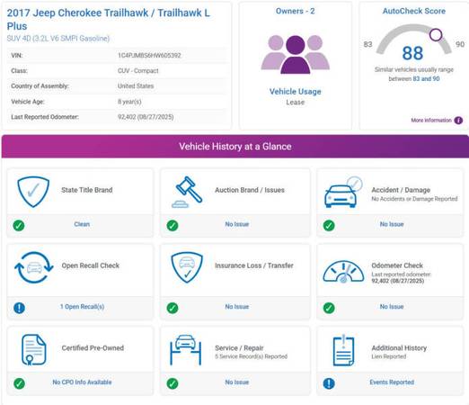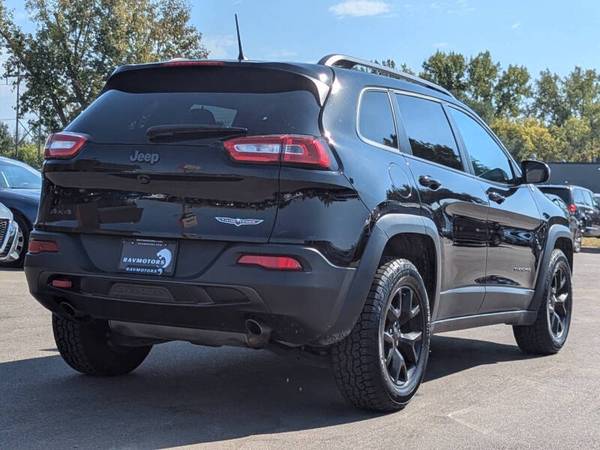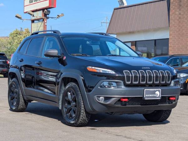 This vehicle is located at our Burnsville store. CLEAN TITLE!! NO ACCIDENTS! NEW TIRES!! FRESH OIL CHANGE!! NEW BATTERY!! NEW STRUTS!! Conquer any terrain with confidence in the 2017 Jeep Cherokee Trailhawk 4x4, a rugged and capable SUV that combines off-road prowess with everyday practicality. Designed for adventure, the Trailhawk trim comes equipped with Jeep’s legendary 4x4 system and features like the Selec-Terrain traction management system, skid plates, and tow hooks, making it ready to take on dirt trails, rocky paths, or snowy roads with ease. Powered by a 3.2L V6 engine, it offers a perfect mix of power and towing capacity, all while maintaining respectable fuel efficiency for its class. Inside, the Cherokee Trailhawk provides a comfortable and tech-equipped cabin, with leather-trimmed seating, an intuitive 8.4-inch Uconnect touchscreen with navigation, Apple CarPlay, and Android Auto, along with plenty of space for both passengers and cargo. Advanced safety features, including blind-spot monitoring and rear cross-path detection, provide added confidence on and off the beaten path. Whether you're navigating city streets or tackling your next outdoor adventure, the 2017 Jeep Cherokee Trailhawk 4x4 is the perfect companion for those who crave versatility, performance, and a true off-road experience. Stop by RAVMOTORS to test drive this car. We’ll be more than happy to help you find the right car at the right price. We don't have any pushy or high-pressure salespeople. So come in and see for yourself why we have been the #1 DealerRater used car dealership of the year 5 years in a row. Extended Warranties and Financing options are available. Call us for vehicle availability at 952-456-4041. For more information and a full inventory visit us at www.ravmotors.com. We are open Monday – Thursday 10 am – 7 pm, Friday - Saturday 9:30 am – 6 pm.