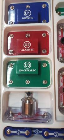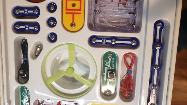 For sale is an educational project kit for making over 100 electronic projects. The circuits are built using reusable components that snap together onto a snap-grid, giving the kit the name Snap Circuits. All the components are there, none missing. The circuit pieces are in excellent condition, but the box shows wear.