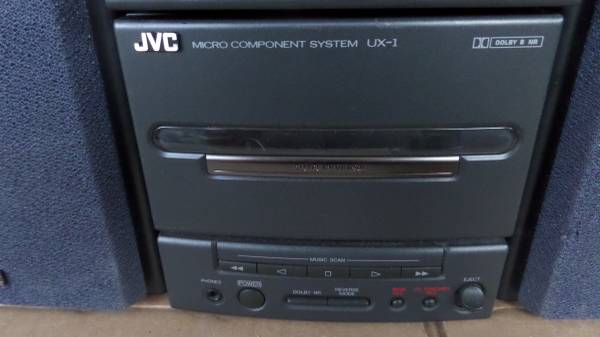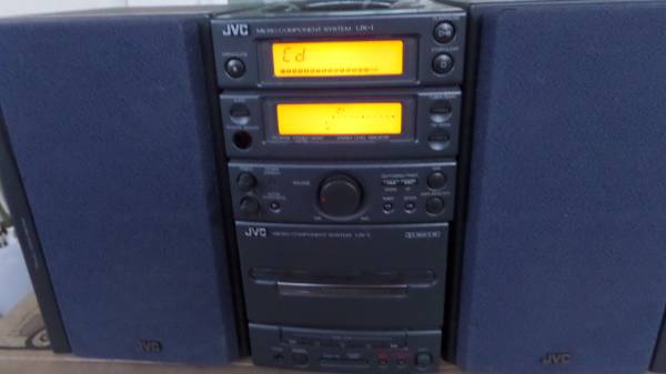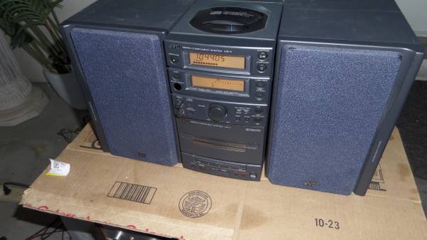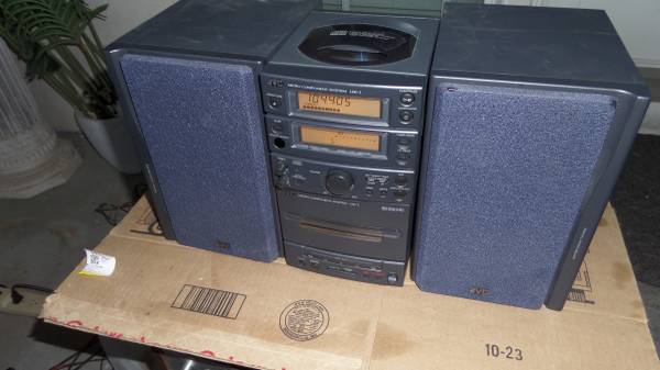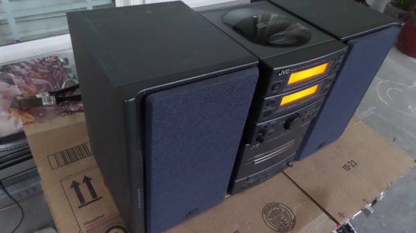 selling a very nice mini component system made by JVC that comes with a cd player cassette deck and AM / FM radio. The CD player works very well, and the cassette player can be played forward or backwards and has recording capability as well. The radio can access all local channels and be stored for future access when needed. The speakers are bass enhanced and comes with bass and treble adjustment buttons. The set up sounds good and will be ideal for a den, studio or a bedroom or even a living room. The speakers are detachable and can be kept separately from the main unit which comes in 2 sections and can be used in larger areas as well.