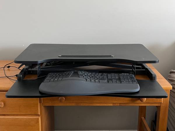 Fully functional desktop sit-stand riser. Lever-actuation makes adjustment smooth and easy. Has lower tray for keyboard and upper level for monitor, laptop and accessories. Full-sized ergonomic...