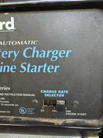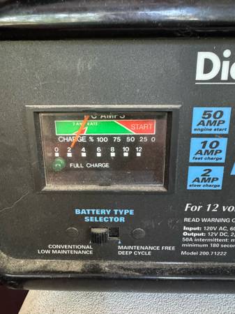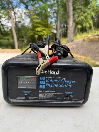 Die Hard battery charger and engine starter. 50 amp engine start/ 10 amp fast charging/ 2 amp slow charge for 12 volt batteries.