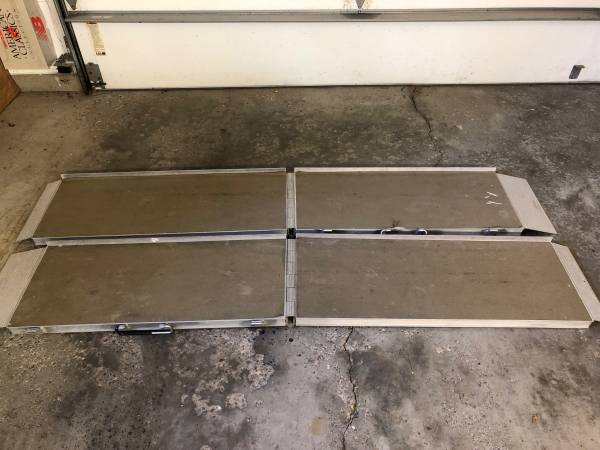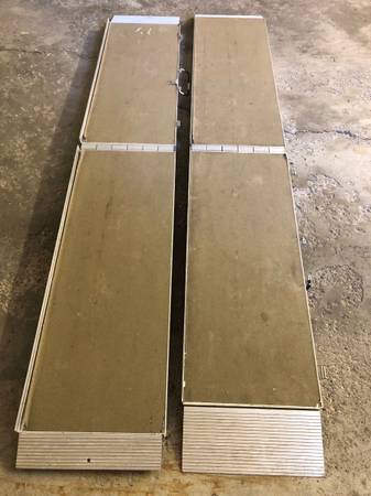 One pair of folding aluminum ramps for sale. Each one is approximately 84" by 14". Good condition but there's one broken hinge section (out of six) on one of them, but it still works. A good welder...