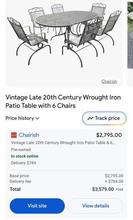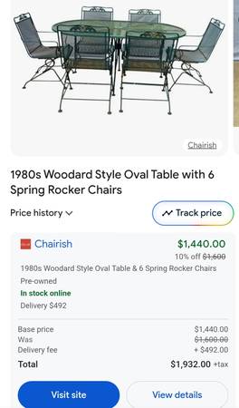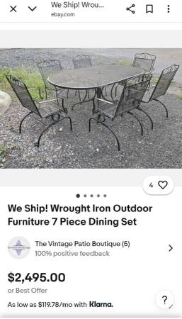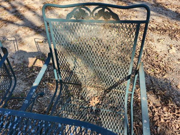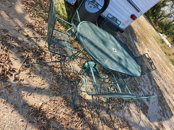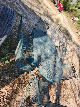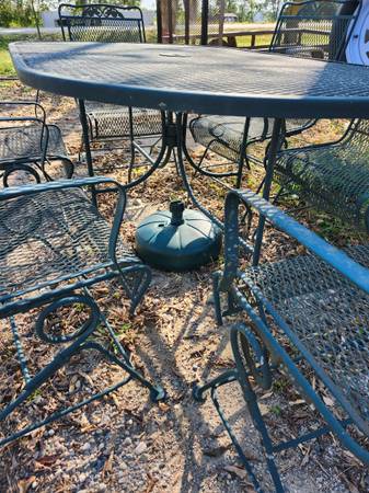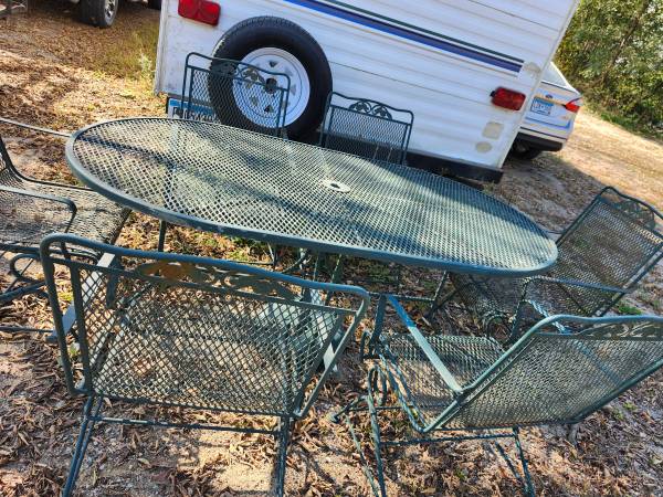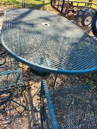 I love this set because the chairs are comfortable and they rock. Very good condition. Hard to find as a set for this price. Comes with 1 oval table, 6 spring chairs and an umbrella base. MAKE AN...