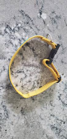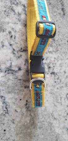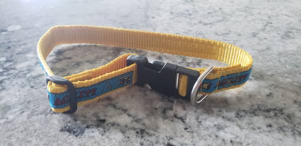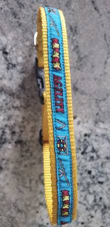 Brand New Yellow and Blue collar with "AGILITY" and agility equipment on it. Has a plastic buckle. 3/4" wide.