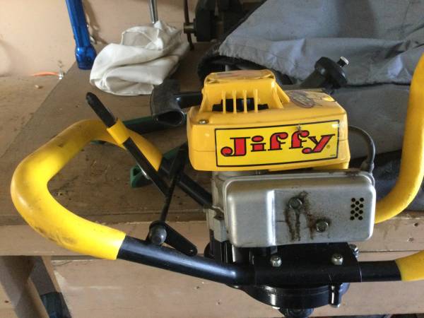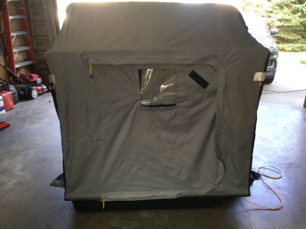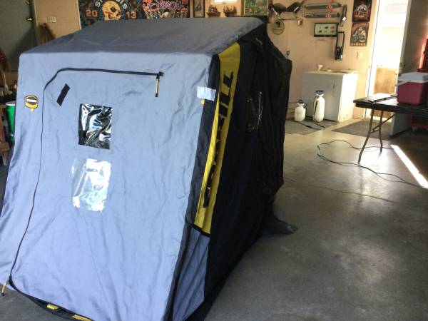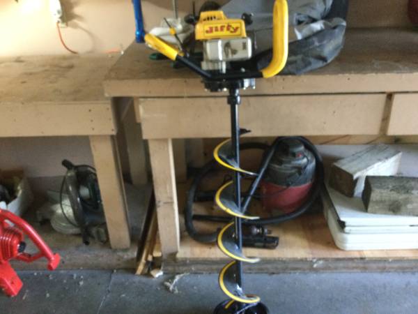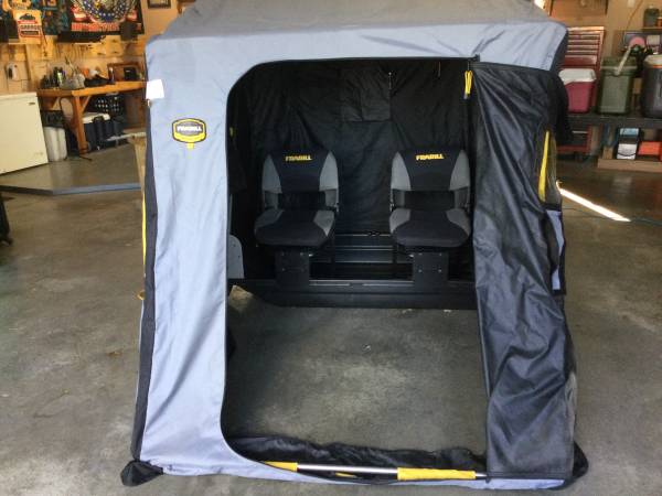 Portable fish house with auger 4 fishing poles carpet and ice scoop House has a small hole a mouse.