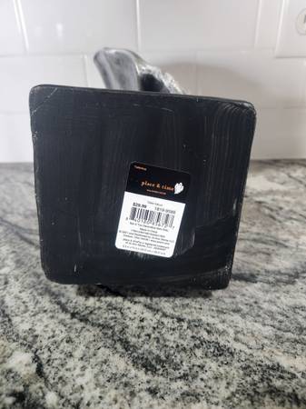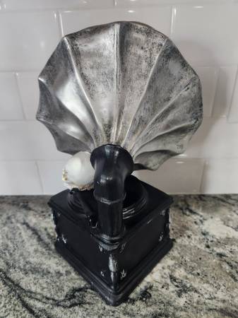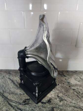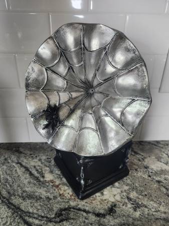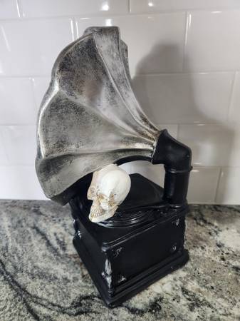 Fun Halloween decoration - old gramophone that has a spider on the horn and a skull behind it. No chips or cracks. Measures approximately 6.5" w x 11.25" t.