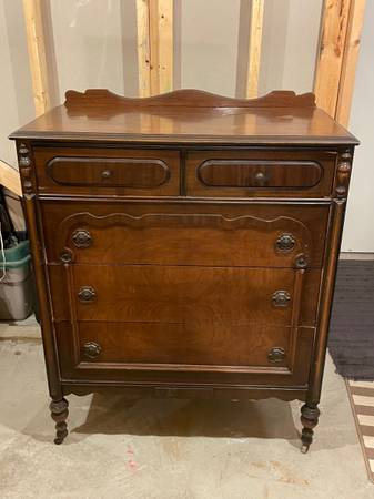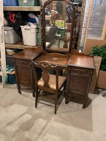 Full size bed frame and headboard Makeup vanity with mirror Dresser Have had in storage so don’t have great pictures. Let me know if you want more photos. This furniture is from the 1930’s.
