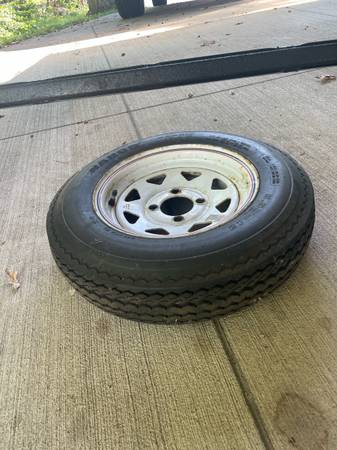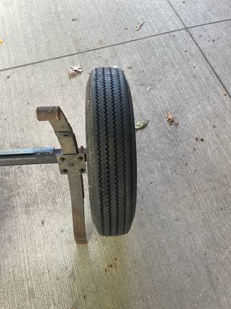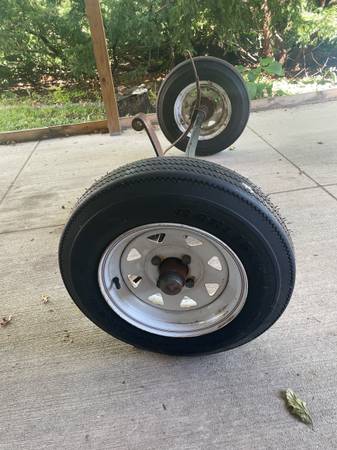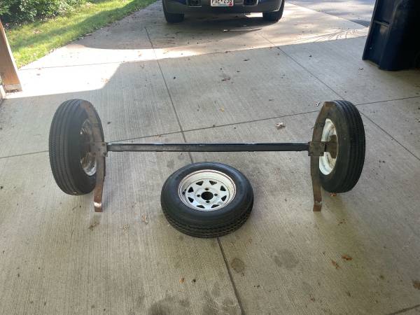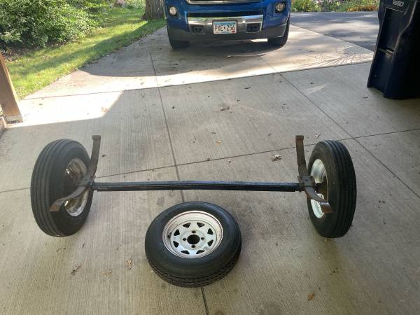 Complete axle with spare tire for sale. Springs are 50” on center. $150.00