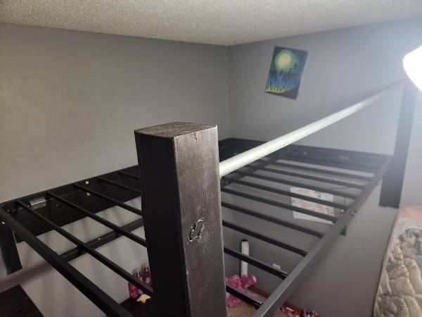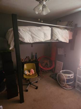 Full bed frame mattress not included bed frame is such that a box spring is not necessary. Includes DIY Loft kit and stairs that double as shelves black. Call Dan 61two3six3776seven
