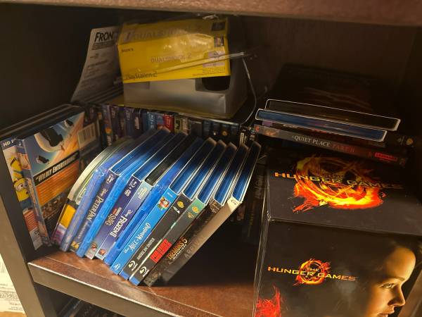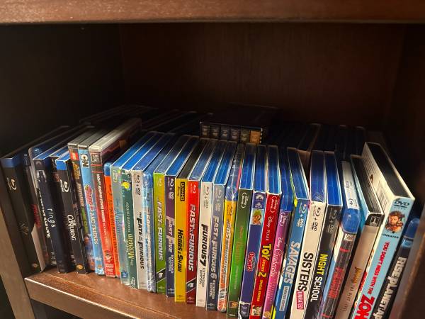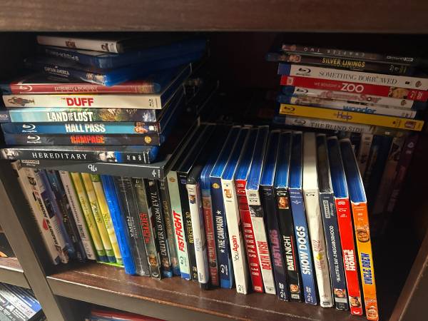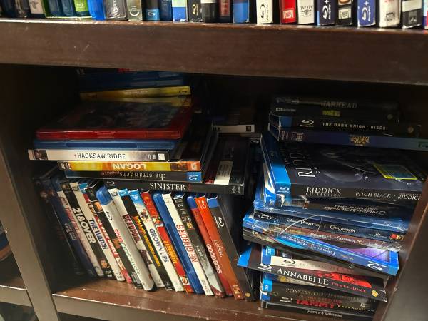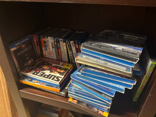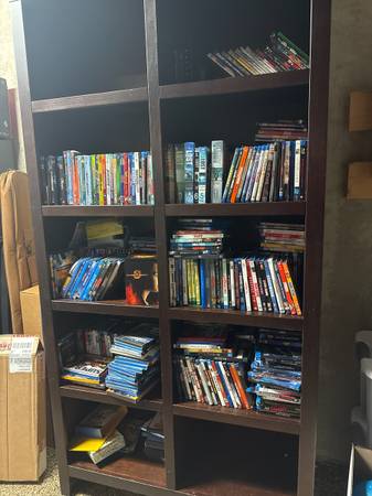 Getting ready to move and started packing up the movie collection. Decided to simply sell the lot. There are hundreds (roughly 500 with a majority being Blu-ray *probably 75% and 20% 4K and 5% dvd) of Blu-ray, 4k, and DVD movies here. Too many to list. Collection worth over $15,000 if I had to guess. Many are unopened. Selling the entire lot for $500 with the bookcase. Kids movies, marvel, horror, comedy, romance, action, thriller, classics, modern, etc. the movies in the shelves are double deep. There are 60ish per box and those were taken from top shelves to give you an idea of quantity. To make this simple, it’s all or none. No splitting them up. Comes with the bookshelf if you want it as well which was worth a few hundred new.