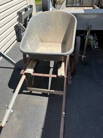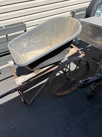 I have a very heavy duty wheel barrow, I put a resin tub off standard wheel barrow on to a vintage cart with steel wheels and frame, used it for rocks, dirt, sand, and gravel. Done with those projects now so selling this, the wheels and cart frame being antique could be desirable for someone on that alone, first $30 can take it. Call show contact info