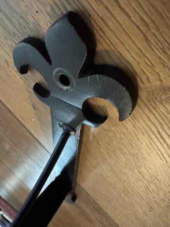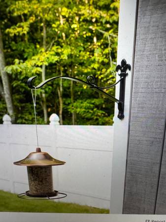 This is a wall-mounted hanging bracket, hand-forged in a traditional decorative style with a Fleur-de-Lis detail at the top. Large and sturdy, it is designed for hanging planters, baskets or birdbaths, with about 10 1/2" of clearance from the wall. Great for large wind chimes, lanterns, bird feeders too.