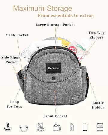 • [MULTIPLE STORAGE POCKETS] With abundant storage, Fleerose doubles as a stylish diaper bag. Large pockets hold diapers and wipes. Side pockets keep keys, phones and pacifiers within easy reach. A bottle holder and attachment loops provide extra organization for toys and sanitizers. All while folding up compactly for fuss-free transport when you're on the go. Leave the clutter behind - this is the only bag you'll need!