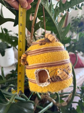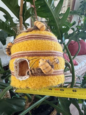 Decorative Beehive Birdhouse (Indoors only). NEW $25.00 Yellow beehive bird house with bee decorations. Lightweight. Great to hang in a patio sunroom, or from a large plant. See photos. Purchased...