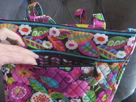 Vera Bradley Laptop Travel Tote in Va Va Bloom pattern. Padded laptop sleeve on one side and a large zip top section on the other. The long sides of these are zipped together and unzip and open flat so the laptop can go through airport security without being removed from the bag. The center zipped area can also work as a portfolio for papers you need to carry. There is a smaller outside zip pocket for a wallet, travel documents, etc. Fits laptops 15'' and smaller. Measures 11.25'' W x 14.75'' H x 3'' D.
