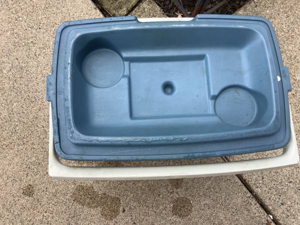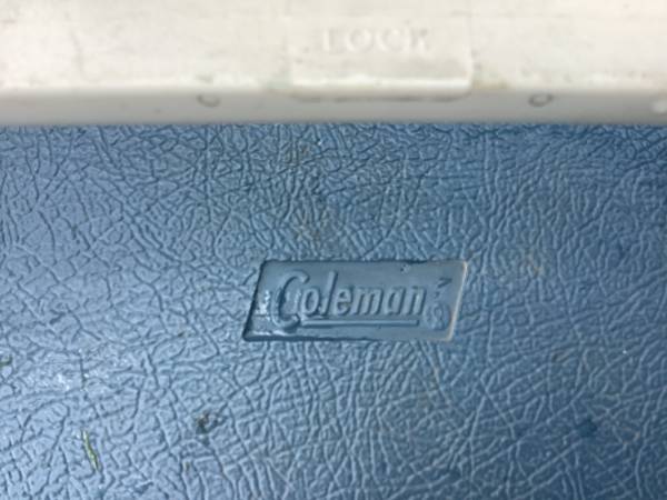 This vintage cooler is designed for outdoor events. Its durable construction and compact size make it easy to carry and store drinks or snacks.