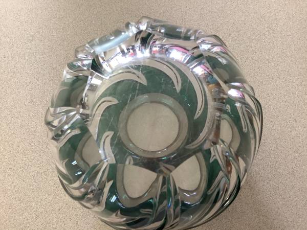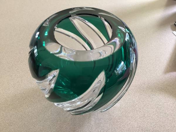 Beautifully designed, elegantly executed. This master creation from the artisans at Val St. Lambert measures 6" x 6"and glows with the emerald green flowing through the flashed crystal vase with an upward swirl design. Etched Val St. Lambert signature on the bottom. 9.5 out of 10 with slight scuff on the base. Make it yours today and enjoy the crystal wonder of craftsmanship. E-mail with questions or to set a pick up time.