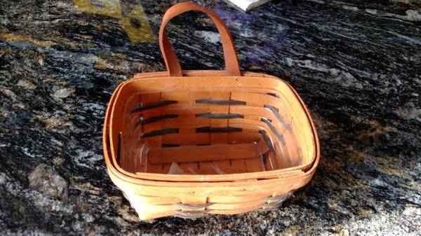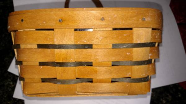 I am selling a 1996 Longaberger Heartland small key basket with blue accents, and a clear plastic liner. Basket measures approximately seven inches by 5 inches by 3 1/2 inches deep. Basket is in excellent condition. This basket also has a metal hanger on the back (see pictures) so that you can hang it on the wall if you desire - thereby the purpose of calling it a "key" basket so you will always know right where they are. Hand signed as well. See pictures!