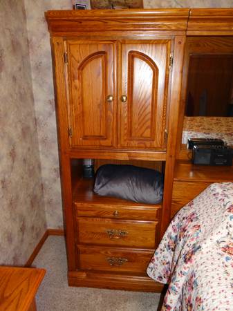Queen size Michael Howard solid wood pier wall unit. Oak finish. 9'5" wide, 18" deep, 5'4" high. Includes 2 pier cabinets with lights,