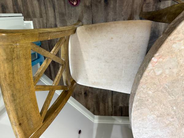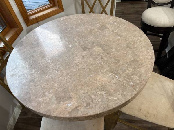 Modern dinning table with four matching counter height chairs. Prefect for small spaces, kitchen, or casual dinning. gently used, structurally sound, no wobbles, it's heavy & needs two strong...
