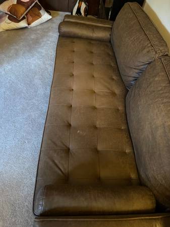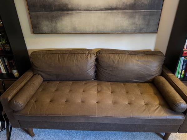 Cool looking sofa, good condition. No pets/no kids. I believe it’s faux leather. 70” long, 30” deep, approx 30” tall to top of back cushion. Round side cushions/pillows removable. Back cushions on...