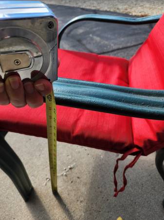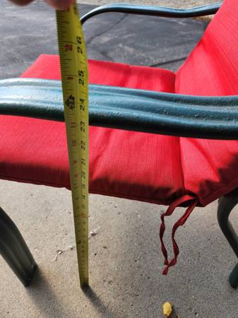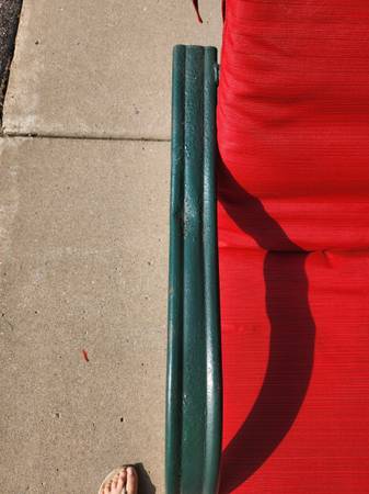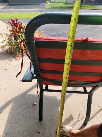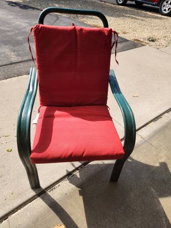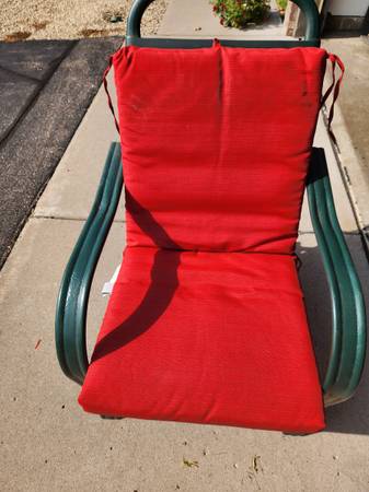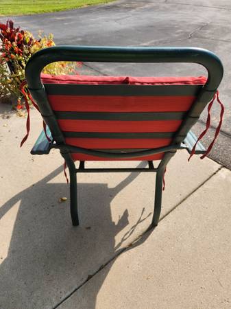 Chairs are metal with rubber seat and back straps. Chairs are comfy with cushions. Cushions in excellent condition- cleaned. $15 obo Cash only Pick up in Otsego Owner can not help lift