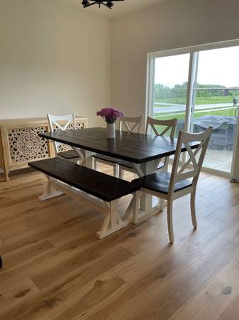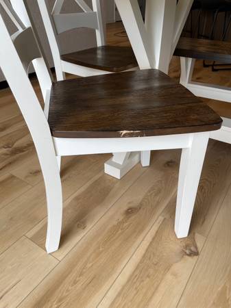 Almost new farmhouse style dining table with 4 chairs and a bench. White with dark brown wood tops. Easily seats 6-7. Solid/sturdy. There are two small blemishes on two chairs from moving (pictured). Measures 72” x 40” and is about 30.5 inches tall. Bought less than a year ago, I’m just looking to buy a round table for this new space.