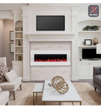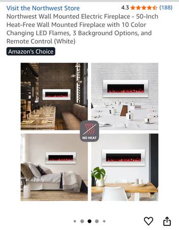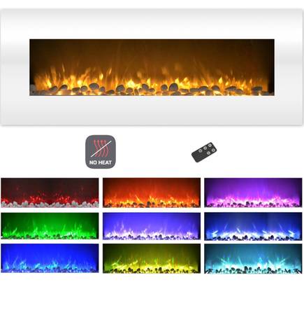 Northwest wall mounted white electric fireplace - 50", Heat-free with 10 color changing LED flames, 3 background options, remote control. Originally purchased on Amazon. Re-packed in original box. Search Amazon to see pictures and video. Product description: 50-Inch Wall Mounted Electric Fireplace - Heat-Free Decor. Model: 80-WSG02-NH