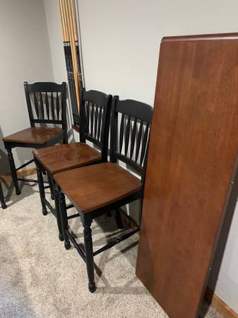 Table high top style is in excellent condition. Table: 36x56 expands with 1 18 leaf to more square shape 54x56. 36 height. 6 chairs included. 2 has minimal scratches on seat.