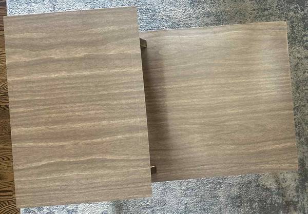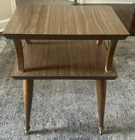Used MCM Side Table Sturdy, but light weight 27"X17" (longest measurements, lower level) 12"X17" (upper level) About 16" high (to first level) About 23" high (to top of second level) Stamped: LIECK...