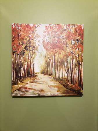 26 x 26" canvas print of path through the trees, brand new! Canvas is stretched on stretcher bars so ready to hang with all hardware in a bag! We bought 2 pieces and keeping one, so selling the other. Colors are true to photos. lots of beautiful oranges, golden yellows, browns, tans, beige's, and greens, an espresso brown almost black.