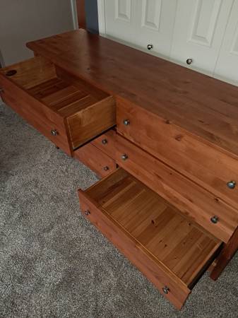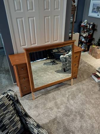 Light/medium cherry dresser with large mirror and night stand. Mirror 37"h x 43"w Dresser 67"w x 18.5"d x 35" h Dresser drawer capacity 14.5" x 27" x 7" Night stand 19"d x 22"w x 26"h Pick up only...