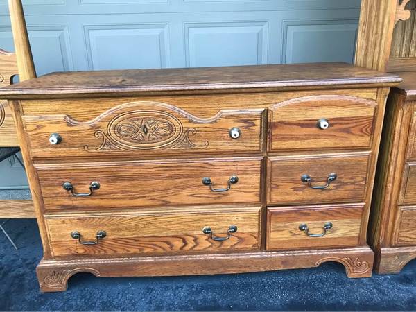 Lovely five piece set includes dresser, desk, hutch 40 long, 46 high and 10 deep that fits either the dresser or the desk, twin headboard and chair.
