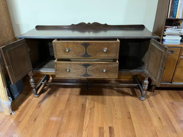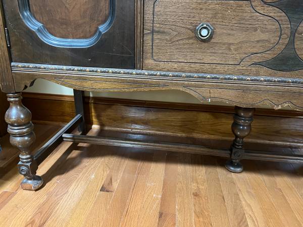 Antique Buffet in good condition. $150 There is a missing piece on the bottom of one leg as seen in one of the pictures. Email if interested.