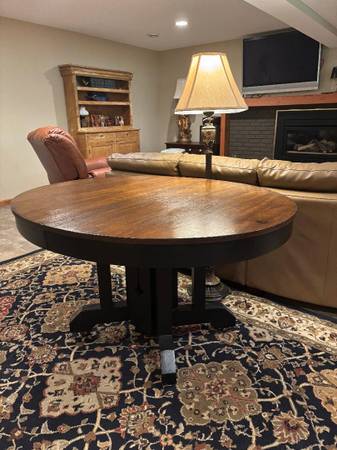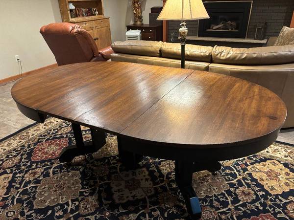 Oak Table, oval shape on casters with black painter pedestal. Nicely refinished. Nice patina, in good condition, Comes with four leafs,
