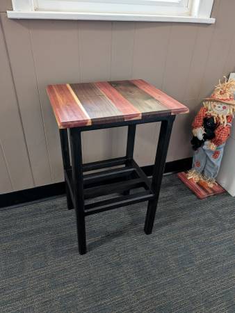 Custom Walnut and purple heart side table on poplar legs with black translucent stain and protected with polyurethane. Table measures:14x16x25