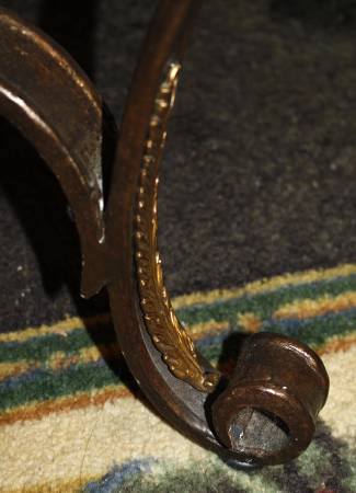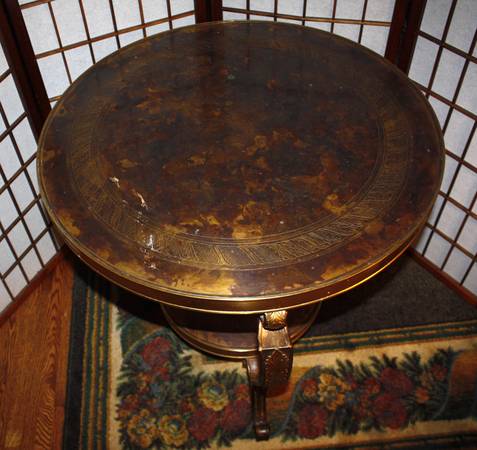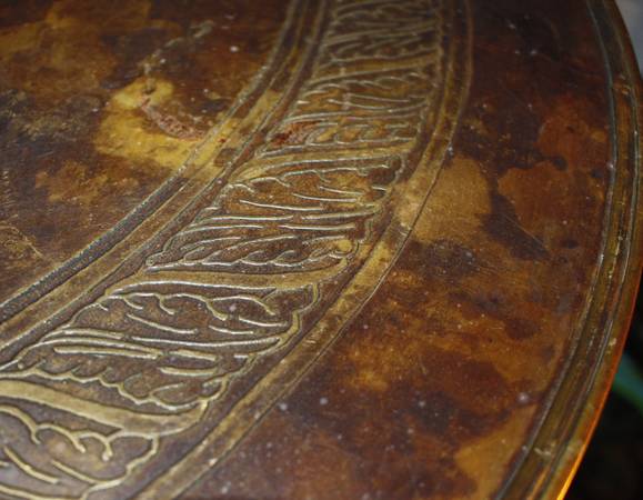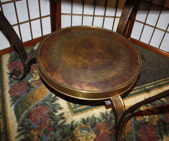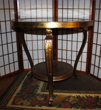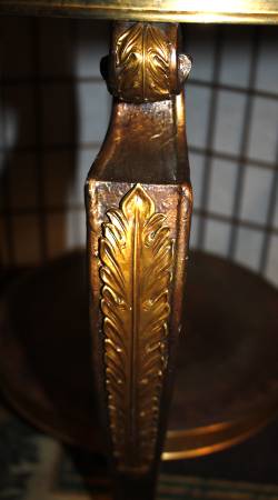 *) Beautiful Etched Brass Lamp Table - table top and bottom shelf are etched with acid creating a beautiful colorful pattern. Similar tables retail for about $2400. The three legs are wrought iron with beautiful leaf pattern adornments. In Great Condition. Dimensions: 26” tall, 30” across (table top is 28.25” across). $789