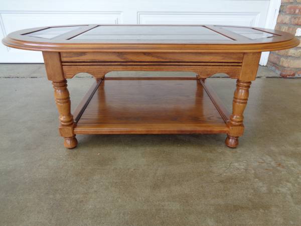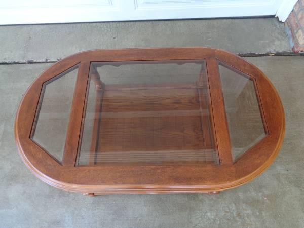 Hardwood Oval Coffee Table with Decorative Three-Piece Glass Top; quality construction--very solid and sturdy; nicely grained hardwood with a medium walnut finish; large lower shelf; 50" long, 30"...